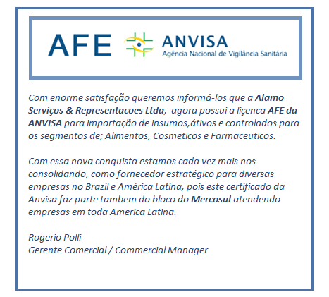 A Empresa, Álamo Representações e Serviços, surgiu de necessidade de um trabalho eficiente e focado no mercado, no cliente e nos produtos que podemos oferecer aos mais de 1.500 clientes que possuímos ao longo de 27 anos de experiência, atuando com os seguintes materiais; Ativos, Aditivos, Ingredientes e Matérias Primas em geral, para os mais diversos seguimentos de mercado.